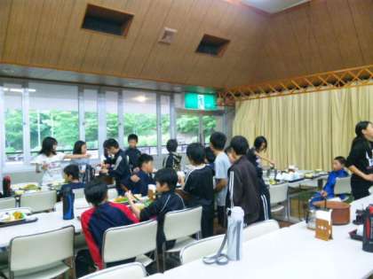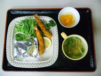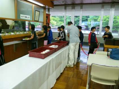 二日目の夕食です。アルミに包まれているのはおいしいハンバーグです。