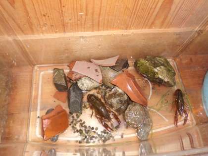 たくさんザリガニがつれて,みんな大喜びです。ザリガニを学校に持って帰ってみんなで世話をしています。ザリガニがすみやすいように石を入れたり,割れた植木鉢などを入れています。みんな休み時間ごとに,ザリガニの入った水槽をのぞきこんでいます。