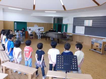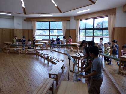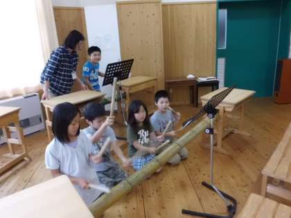 音楽の授業で,リズムをつなげて竹太鼓でたたいて表現する学習をしました。友達とリズムがなかなかあわなくて初めはたいへんでしたが,みんな一生懸命練習して友達と合わせることができました。