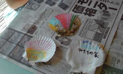 思い出の作品作りです。貝殻にペインティングしています。
