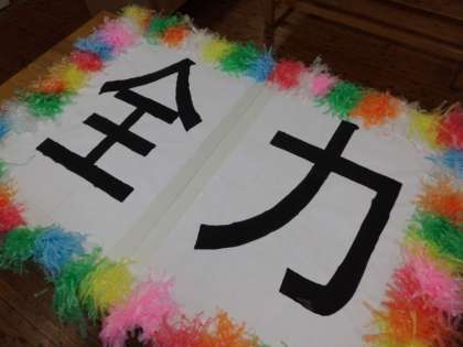 みんで協力しながら,絵の具で文字を塗り,周りを梱包用平テープでカラフルに飾り付けしました。
