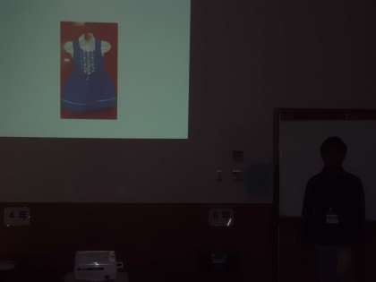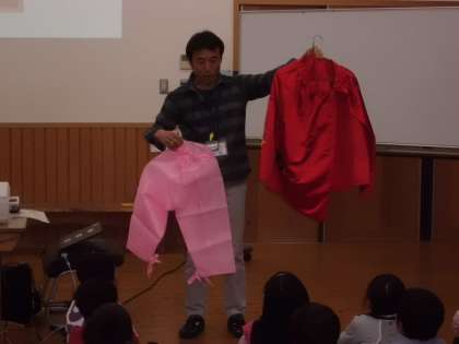 今日の朝会は,「ほっとデイ」。飯田先生のお話です。世界の民俗衣装を紹介しながら,それぞれの国にはそれぞれのよさがあり,仲良くしていくことが大切だと話されました。