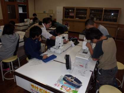 家庭科室では,5年生が家庭科の学習で初めてミシンを使っています。ミシンの各部の名称や仕組みを確認し,いざ糸を順番に通していきますが,これがなかなか大変。学校支援ボランティアの先生にも支援していただきながら奮闘していました。