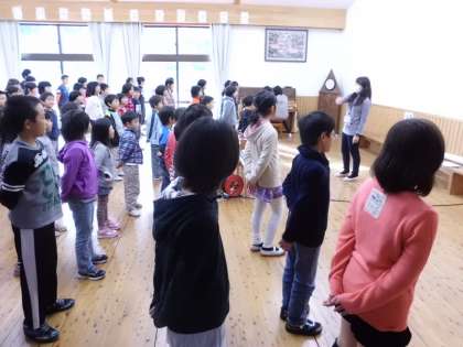 最後に全校で歌を歌いました。今日は,6年生のお友達二人の伴奏で歌いました。学習発表会に向けて頑張りましょう。