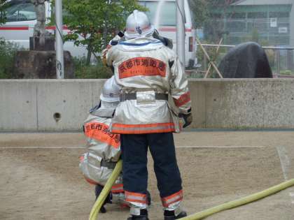 始めに,消防署の方が防火・防災についての話をされました。次に,放水作業を見学しました。きびきびした姿に子どもたちは感心して見入っていました。その後,全校児童で「消防の図画」に取り組みました。消防自動車の真っ赤な車体,黒くて大きいタイヤ,長く伸びるホースなど細かいところまで観察して描きました。