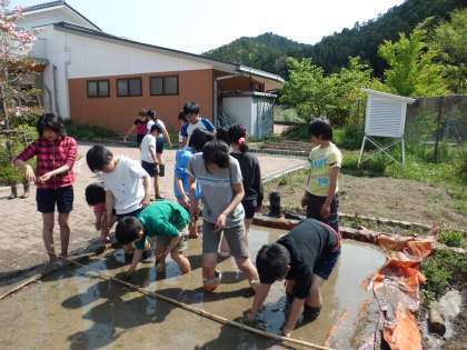 竹の節を使って,手作業で苗を植えました。そんなに広くない田んぼですが,手で植えていくと,とても時間がかかりました。「まだ,半分しか終わってない。」と,田植えの大変さを実感していたようでした。