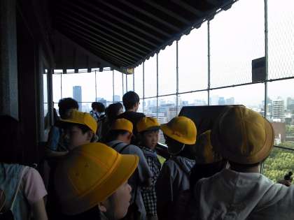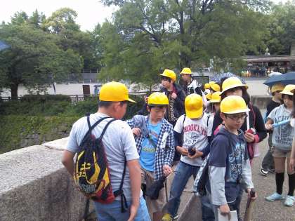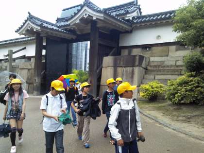 大阪城を見学しています。小雨が降り出しましたが,みんなが歩くと雨が止みました。