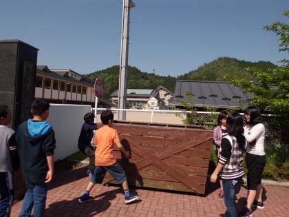 学校の外に大きな茶色の箱が出ています。そこに,つぶさないで洗った空き缶をいれてください。皆様の空き缶をお待ちしております。