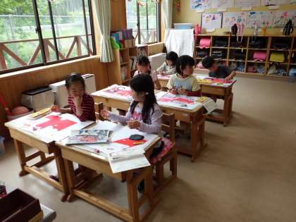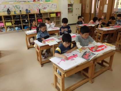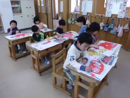 図画工作科の時間に消防車を描いています。赤のパスでしっかり着色するとぐんと消防車らしくなりました。