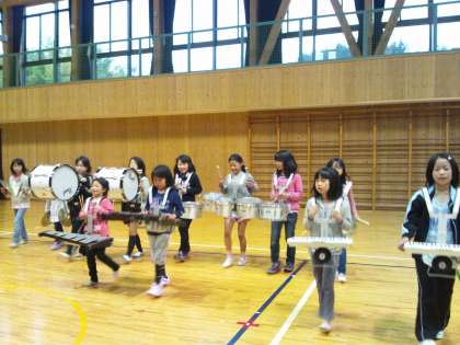 楽器をさわってみたり,肩にかけて歩いてみたりと,初めての子どもたちも