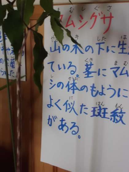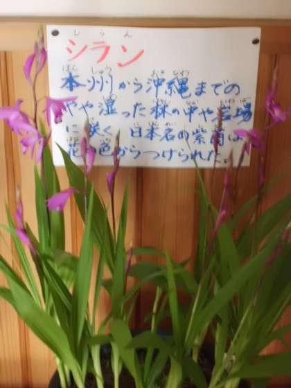 地域の方が,また珍しい山野草を持ってきてくださいました。その名も「シラン」と「マムシグサ」です。草花を通して新しい発見がたくさんあります。