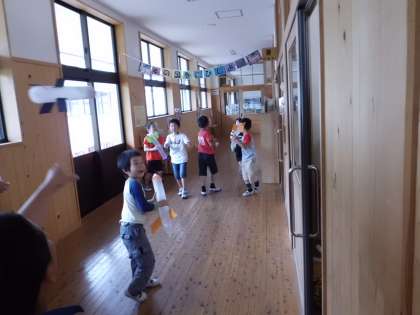 休日参観の親子活動で,ロケットを作りました。ロケットは,紙コップで作るものと傘袋で作るものの2種類です。できあがったら,嬉しそうにロケットをとばしている子どもたちでした。