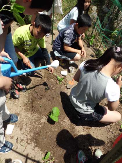 理科の学習で種から育て,観察しているツルレイシが大きくなってきたので,畑に植えかえました。苗を傷つけないようにやさしく作業しました。これからどのように成長していくのかとても楽しみです。大きな実ができるでしょうか。