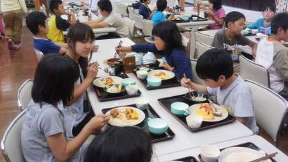 昼食です。伐採体験を終えた子どもたち。もりもり食べています。午後は乗馬体験です。