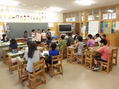 写真は2年生と5年生の様子です。2年生は昨日川で見つけた生き物などの観察をしています。5年生は長期宿泊学習のまとめをしています。どの学年も一生懸命学習に取り組んでいます。