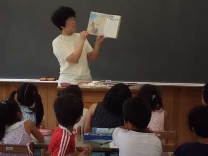 今日の朝読書の時間に,【絵本大好き!京北お話の会】の斎田さんが読み聞かせに来てくださいました。
