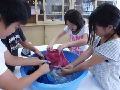 洗濯物の重さを図り,水と洗剤の量を決めて丁寧に手でつまみ洗いをしました。その後,2〜3回すすいでしっかりとしわをのばして,干しました。