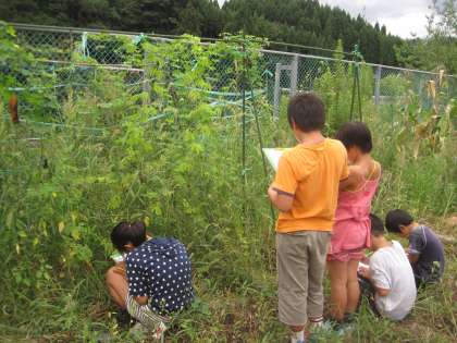 つるも伸び,実もたくさんなっていて夏休み前との様子の違いをしっかり観察しました。夏休みの間にいくつかの実は熟し,はぜているものもありました。