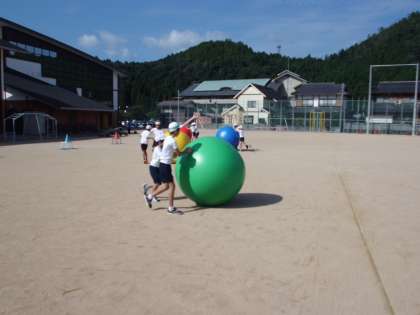 1校時は,全校で運動会の練習です。写真は大玉リレーの練習の様子です。ルールを確認して”よーい ドン!”。「がんばれー!がんばれー!」の声援の中楽しく練習しました。