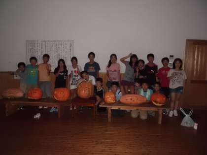 ちょうど地域の方にいただいた巨大カボチャの中にろうそくを灯し,少し早い「ハロウィン」ができました。