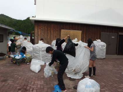 京北第一小の伝統的な活動の空き缶回収作業を行いました。毎月,地域の方に空き缶を洗ってつぶさず持ってきていただいています。その空き缶を年に何度か1000リットルほどの袋に詰めて業者に持ち帰ってもらい,換金をしています。そのお金を福祉に役立てようと,地域の老人介護施設に車いすを贈ったり東日本大震災の義援金にしたりしています。