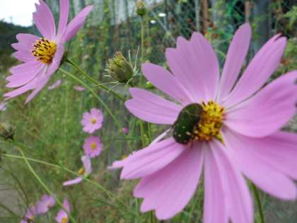 校舎裏のコスモスはきれいに咲き,虫が蜜を吸いに来ていました。