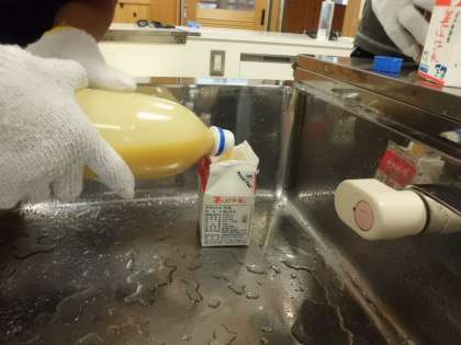 苛性ソーダと水を混たものをよく振り,それに廃油を入れます。それから,ドロドロになる(乳化)までしっかりと振り続けます。すると環境に優しい「廃油石けん」の出来上がりです。