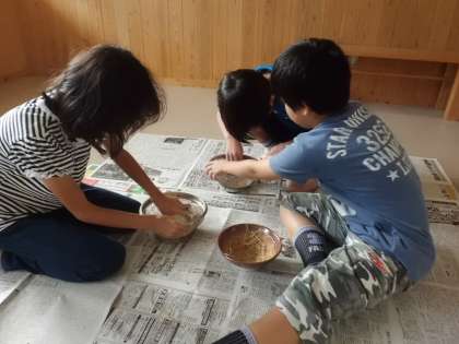ザルと軟球を使って,手作業で精米しました。「腕が痛くなってきた・・・」「指の感覚がなくなってきた・・」と,大変さを感じながらの作業でした。