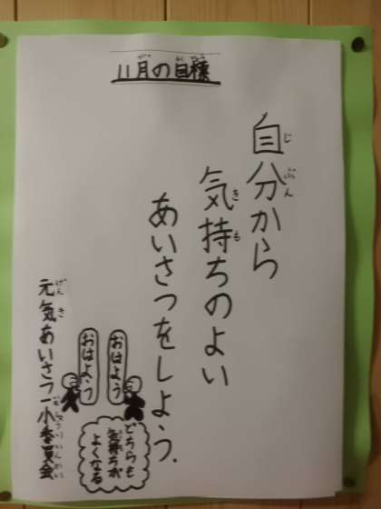 元気あいさつ一小委員会で考えた11月の目標は,「自分から 気持ちのよい あいさつをしよう」です。みんなで気持ちよく過ごせるようにこの目標を大切にしていきましょう。