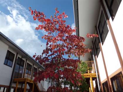 11月14日(木),久しぶりに晴れました。あたたかくやわらかい日差しが降り注ぎ,中庭のハナミズキの紅葉がとてもきれいです。