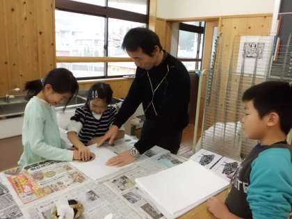 図画工作科で『うつしてみると』の学習をしています。今日から紙版画の印刷に取りかかりました。自分のつくった版にインクをつけて,和紙にうつす活動を子どもたちは心から楽しんでいました。出来上がりが楽しみです!