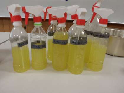 みかんの皮を集めて日陰干しをして,オレンジオイルスプレーを作りました。これはミカンの皮と水だけで作るのですが,汚れを結構落としてくれます。