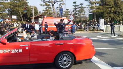写真は,一昨日(12日)にみやこめっせ付近で行われた京都市消防出初式の様子です。本校5年生児童が消防の図画で優秀な作品を描いたので,オープンカーに乗ってパレードしました。とてもいい記念になりました。