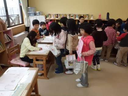 お買い物バッグは新聞紙で,お財布は折り紙で作りました。お店の品物は,国語科の学習で作ったカードを使いました。ポイントカードは,店員である1年生と保育所のお友達が買い物をするとき,じゃんけんをして保育所のお友達が勝てば,シールを2個貼ってもらえます。買い物が始まると,1年生は大興奮。「いらっしゃいませ〜。」と大きな声が飛び交いました。保育所のお友達も買い物が終わったあと「楽しかった〜。」と言ってくれたので,とても満足した1年生でした。