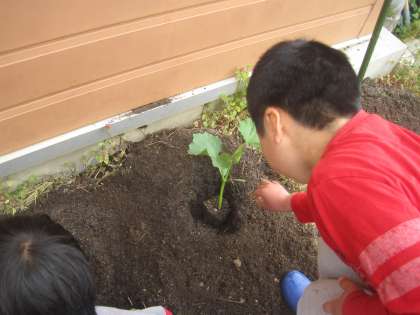 これから色々な野菜を育てていくために,畑を2人で耕し,肥料を入れて野菜を育てる準備をしました。まずは,プチトマトとキュウリの苗を植え,トウモロコシと二十日大根の種をまきました。これからどのように成長していくか観察していきたいと思います。「りっぱな実ができたらおいしく食べたいなあ。」と今から期待が膨らんでいます。