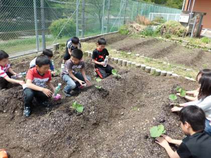 ナス・キュウリ・トマト・ピーマン・カボチャの苗を植えました。おいしい野菜ができるように,みんなで大切に育てます。「やさいの赤ちゃん,大きくなあれ!」