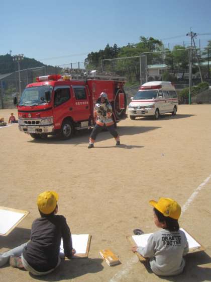 昼休みに1年生の友達ととシーソーで遊んでいると,学校に消防車がやってきました。二人は大喜びで近づいてじっくり見せてもらいました。5時間目に消防署の方から火事についてのお話を聞いた後,放水も見せていただきました。大きな消防車を画面いっぱいによくみて描くことができました。