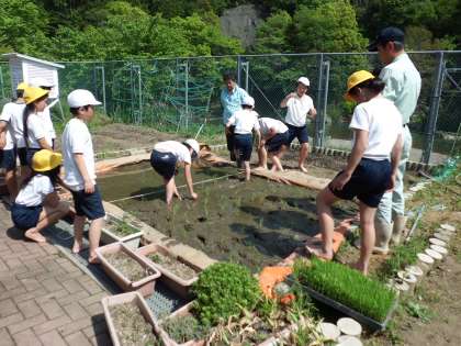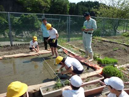 学校の小さな田んぼに田植えをしました。JAの河合さんと中川さんにこの日も来ていただき,田植えの仕方を教わりました。