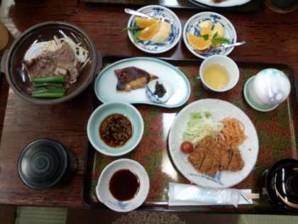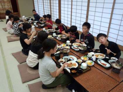 豪華な夕食です。みんなもりもり食べていますが,結構量が多いのでなかなか食べきれないようです。お肉にカツに魚茶碗蒸し,味噌汁,デザートです。夕食後は,夜景を見に出かけます。