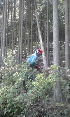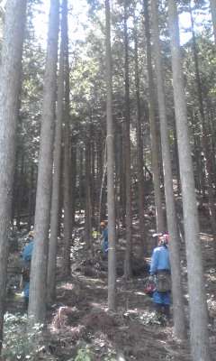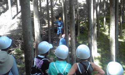 本日午前中の活動,合併の森での間伐材の伐採見学と伐採体験の様子です。
