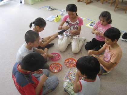 休み時間に来てくれた友達と一緒に美術クラブで作った作品を作りました。黙々とビーズをつなげ,色とりどりの動物や虫ができました。