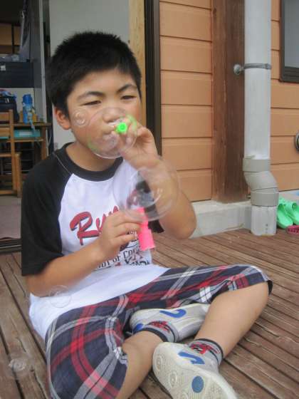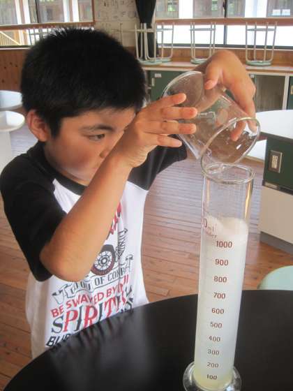 学級活動の時間に使うシャボン液を作りました。理科室で水,水のり,食器用洗剤の分量を量り,ゆっくり混ぜ合わせました。割れにくくするためにガムシロップも入れて完成です。自分で作ったシャボン液で作るシャボン玉は,いつもよりきれいで大きく感じました。