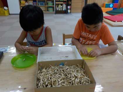 冬の野菜作りに向けて,大根の種を2人で用意しました。乾燥させた大根の実を指で小さくちぎっていくと中からかわいい種が出てきます。細かい作業でしたが,「大きな大根になあれ!」とお願いしながら集中して取り組めました。