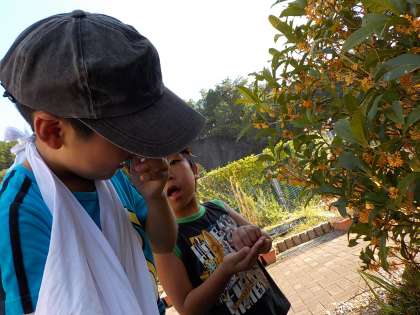コスモスや金木犀の花がきれいに咲いていました。日陰はとても涼しく秋らしくなってきました。
