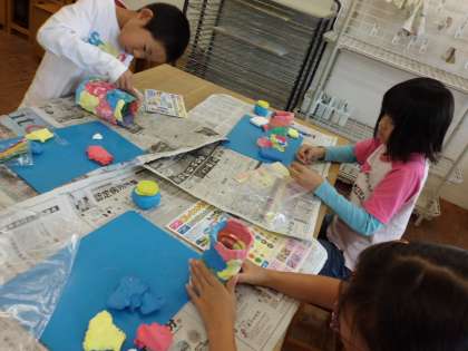 土台となるペットボトルにカラフルなねん土やビーズ,モールなどを組み合わせて飾りつけ,自分だけのペン立てをつくりました。様々な色や形の楽しい作品ができ上がりました。