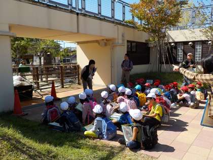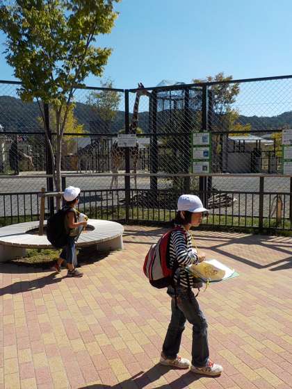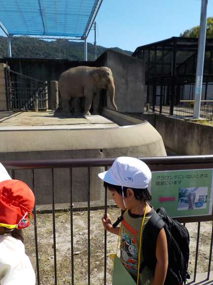 1年生は社会見学で京都市動物園に行きました。グループでクイズを解きながら,ゾウやキリン,シマウマなどたくさんの動物を見ることができました。お弁当を食べた後は,ヤギやヒツジにえさをあげたり,さわったりすることもできました。とてもよい天気のもと一生懸命見学したので,帰りのバスではぐっすり眠ってしまいました。
