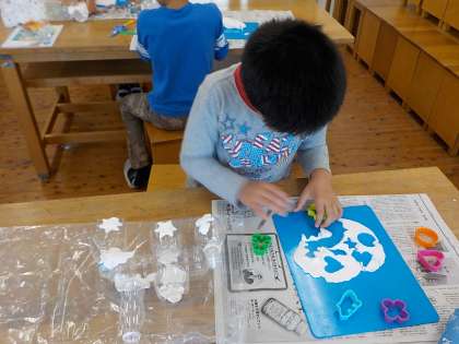 ペットボトルを使って土台を作り,そこに型抜きした粘土を貼っていきました。汽車のデザインの建物が出来上がってきています。完成作品が今から楽しみです。