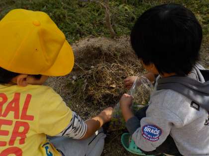生活単元学習の時間に校舎の周りを観察して,きれいな実や葉っぱをたくさんみつけました。みつけた「秋の色」を並べて「何か作りたいなあ。」という気持ちが高まりました。