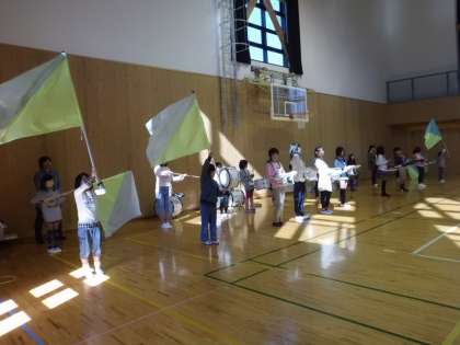 「ルパン・コナンのテーマ」は細かいリズムが拍に合うように,また「ディズニー・メドレー」では,カラーガードの子どもたちが実際にフラッグを持って動きを中心に練習を進めました。