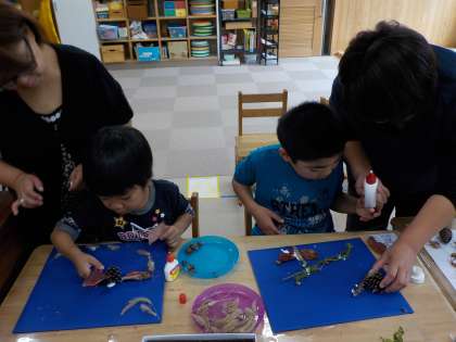 生活単元学習の時間に,みつけてきた「木の実」や「葉っぱ」を使って「動物づくり」に挑戦しました。「この赤い実を目にしようかな」「この葉っぱでチョウをつくろうかな」とお家の人と一緒に相談しながら楽しい作品を完成させることができました。